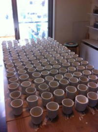 2011.12 幼稚園の卒業制作。 幼稚園児たちが卒業記念に湯のみを作りたいと言う事で 先日、宮前区の幼稚園にお手伝いに行ってきました。 出来上がった作品を持ち帰って乾燥・素焼き・ヤスリがけ・釉薬掛けが終わり これから気泡や底の処理をして本焼きをします。 園児たちがとても一生懸命に作っていたので綺麗に焼きあがって みんなに喜んでもらえると嬉しいです。 一生の記念にしてもらえたらと |